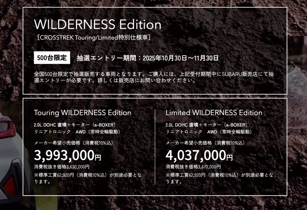 新車提供兩種等級:Touring WILDERNESS Edition 與 Limited WILDERNESS Edition,均搭載 2.0L DOHC 直噴引擎與電動馬達組成的 e-BOXER 混能系統,配合 Lineartronic 無段變速箱與 Symmetrical AWD 對稱式全時四輪驅動。前者建議售價為 3,993,000 日圓(含稅),後者為 4,037,000 日圓(含稅)。兩款皆需另支付標準工賃 62,920 日圓。